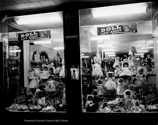 Love seeing the dollies in the dime store window....esp. love the "nun" dolls in corners next to windows' mid-section.